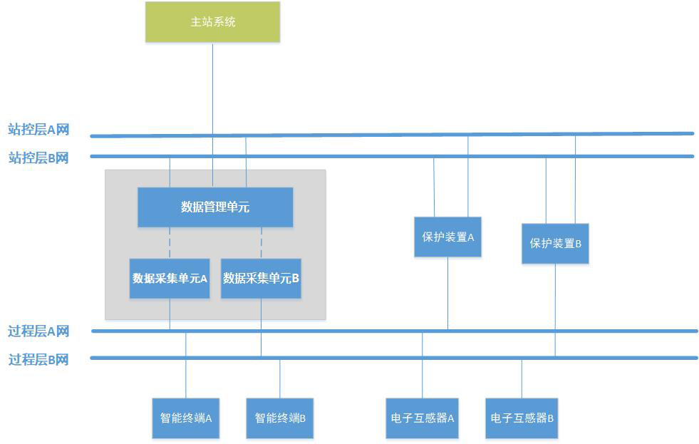 智能变电站保护设备在线监视与诊断装置包含数据采集单元和数据管理单元两部分,数据采集单元接入过程层网络,获取继电保护设备的SV、GOOSE数据,数据管理单元接入站控层网络,通过MMS协议获取继电保护的事件、告警、遥信变位等信息,实现实时数据的记录与分析、智能诊断、安全措施校验等。